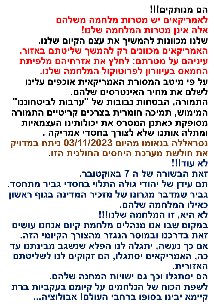 נסראללה בנאומו מהיום 03/11/2023 ניתח במדויק את חולשת מערכת היחסים החולנית הזו.